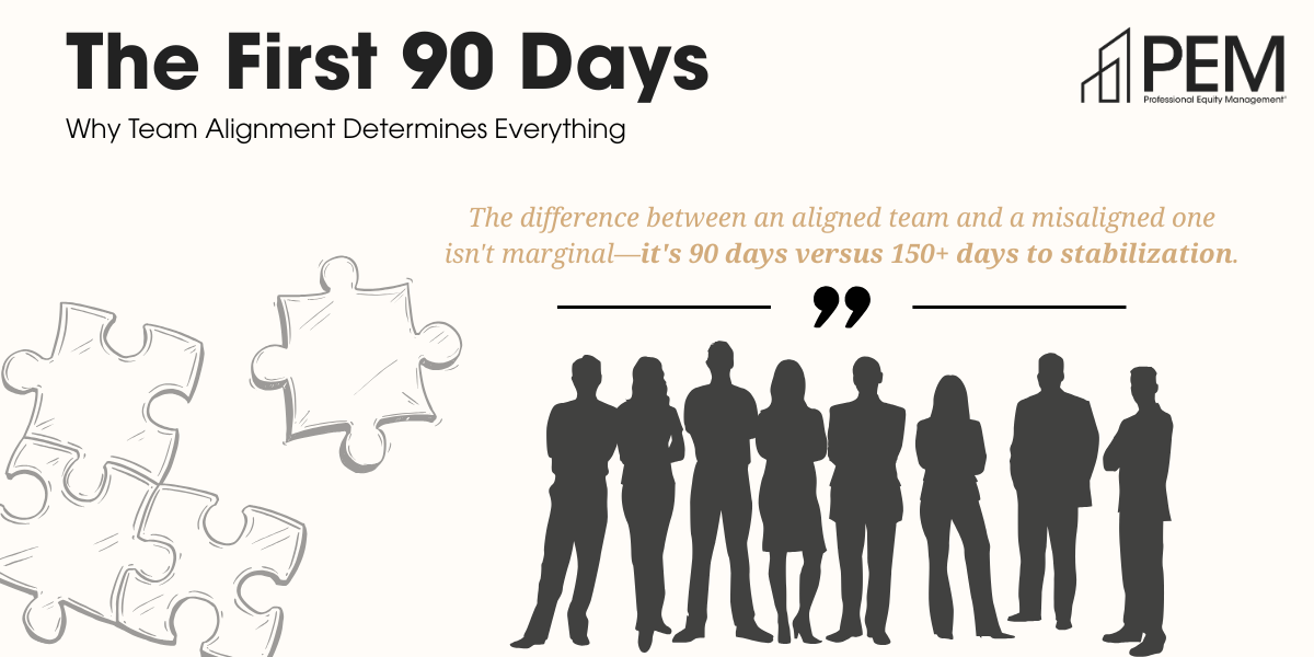 Team alignment determines everything. The difference between an aligned team and a misaligned one isn’t marginal—it’s 90 days versus 150+ days to stabilization. That 60-day gap represents over $100,000 in lost value on a 200-unit property.